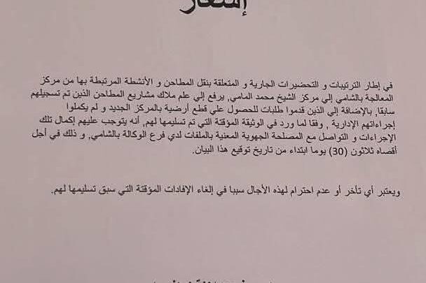 وشمل الإعلان أيضا من سبق لهم التقدم بطلبات للحصول على قطع أرضية بالمركز الجديد دون استكمال الإجراءات الإدارية، حيث طالبتهم الشركة بالتواصل مع المصلحة الجهوية المختصة لدى فرع الوكالة في الشامي، في مدة أقصاها ثلاثون (30) يوما