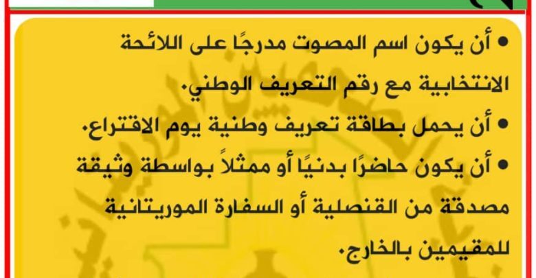 • أن يكون حاضرًا بدنيًا أو ممثلاً بواسطة وثيقة مصدقة من القنصلية أو السفارة الموريتانية للمقيمين بالخارج تحمل رقمه الوطني وكذا الرقم الوطنيللموكل.