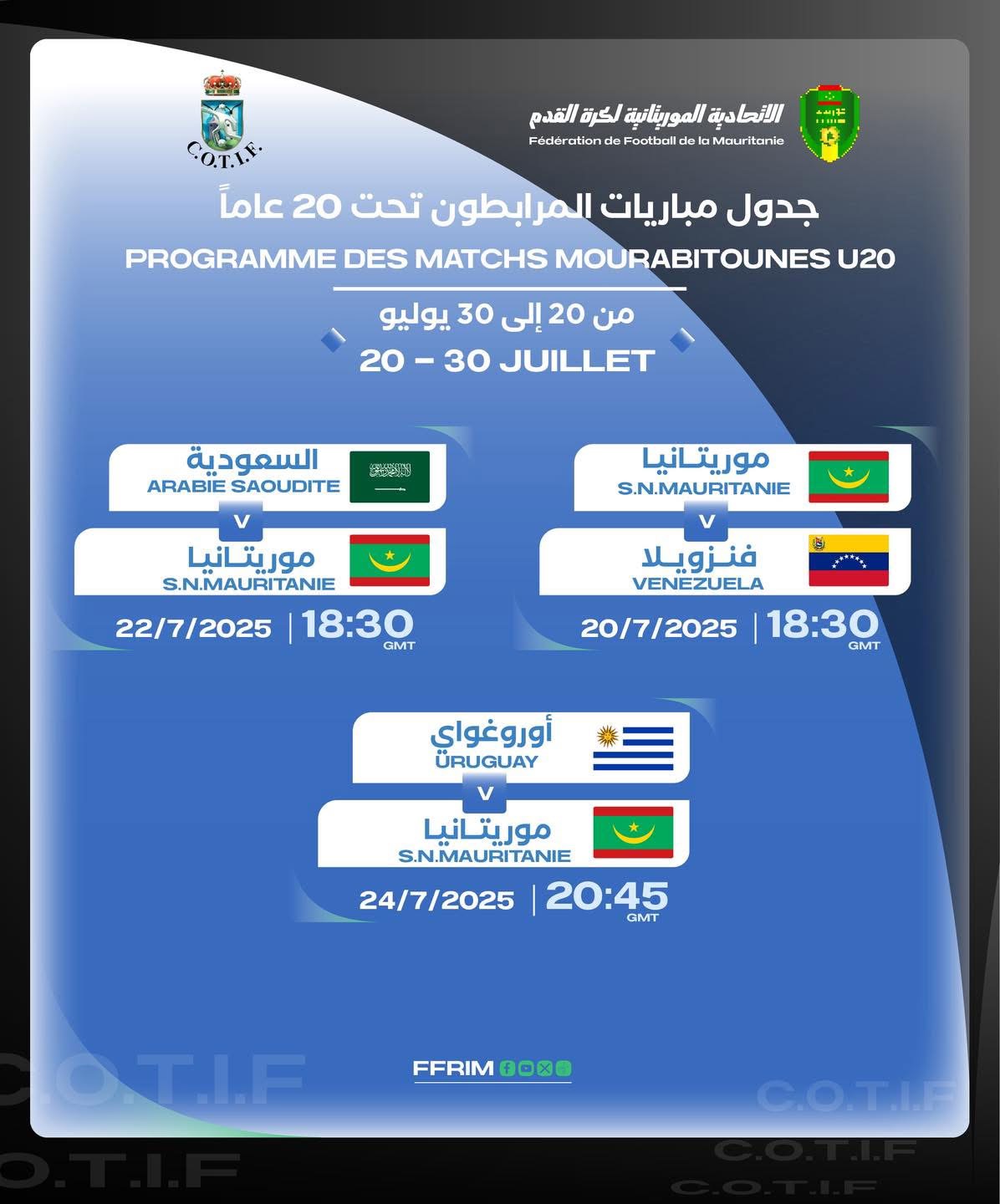 مباريات “المرابطون” تحت 20 عاماً في البطولة الدولية “كوتيف”، التي ستُقام في إسبانيا في الفترة من 20 إلى 30 يوليو الجاري.