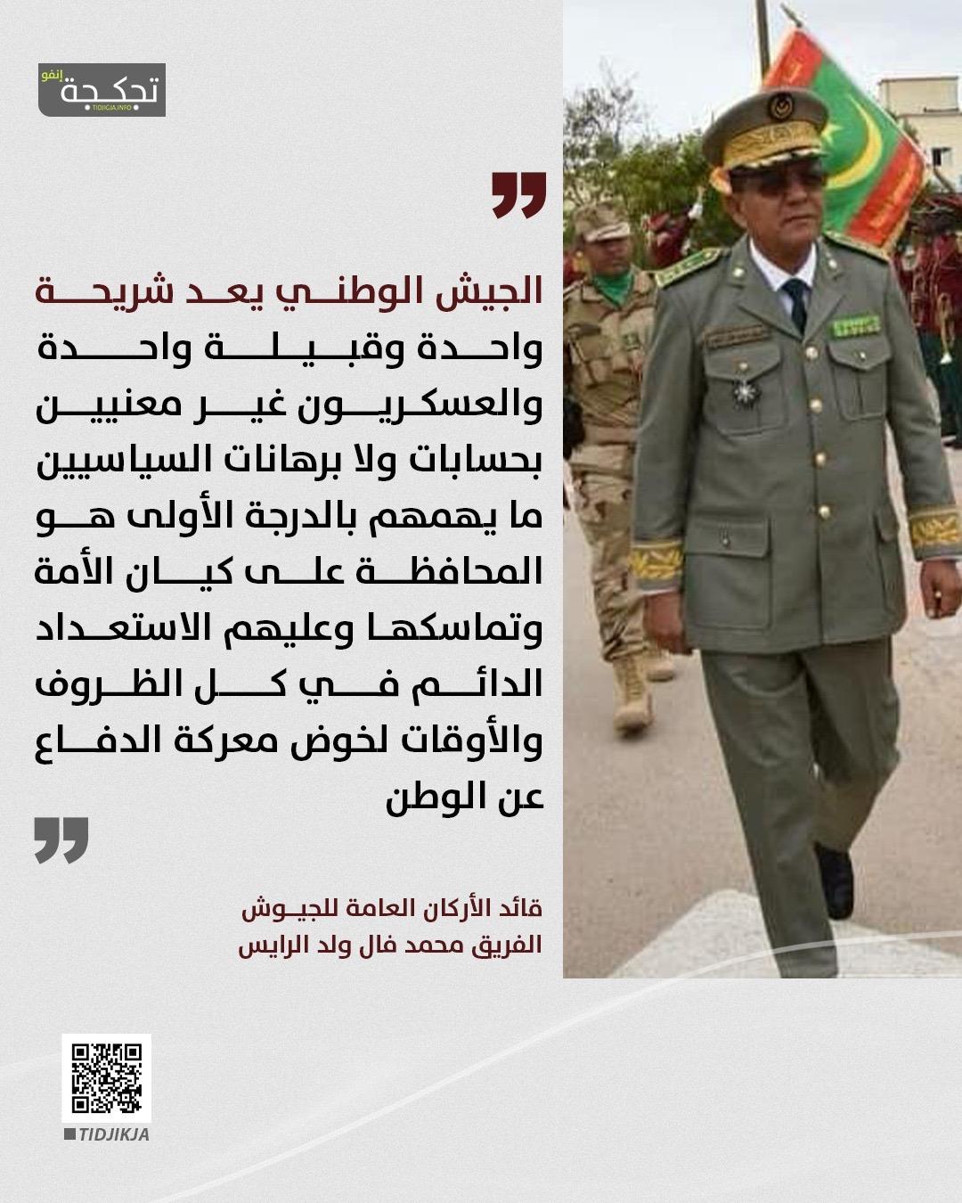 قال قائد الأركان العامة للجيوش الفريق محمد فال ولد الرايس إن الجيش الوطني يعد شريحة واحدة وقبيلة واحدة، مؤكداً أن العسكريين غير معنيين بحسابات ولا برهانات السياسيين.