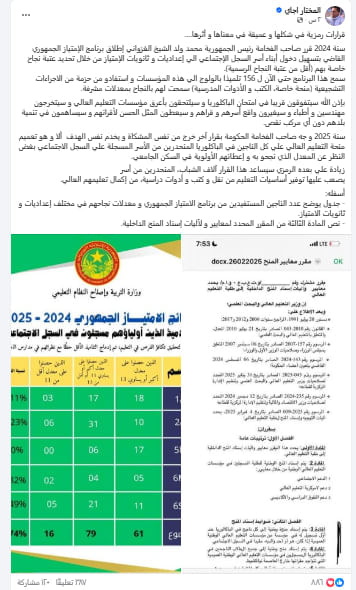 وأوضح الوزير الأول إلى أنه في سنة 2025 وجه الرئيس غزواني الحكومة باتخاذ قرار آخر يخدم نفس الهدف، ويتمثل في تعميم منحة التعليم العالي على جميع الناجحين في البكالوريا المنحدرين من الأسر المسجلة على السجل الاجتماعي، بغض النظر عن معدلات نجاحهم، مع إعطائهم أولوية في السكن الجامعي.