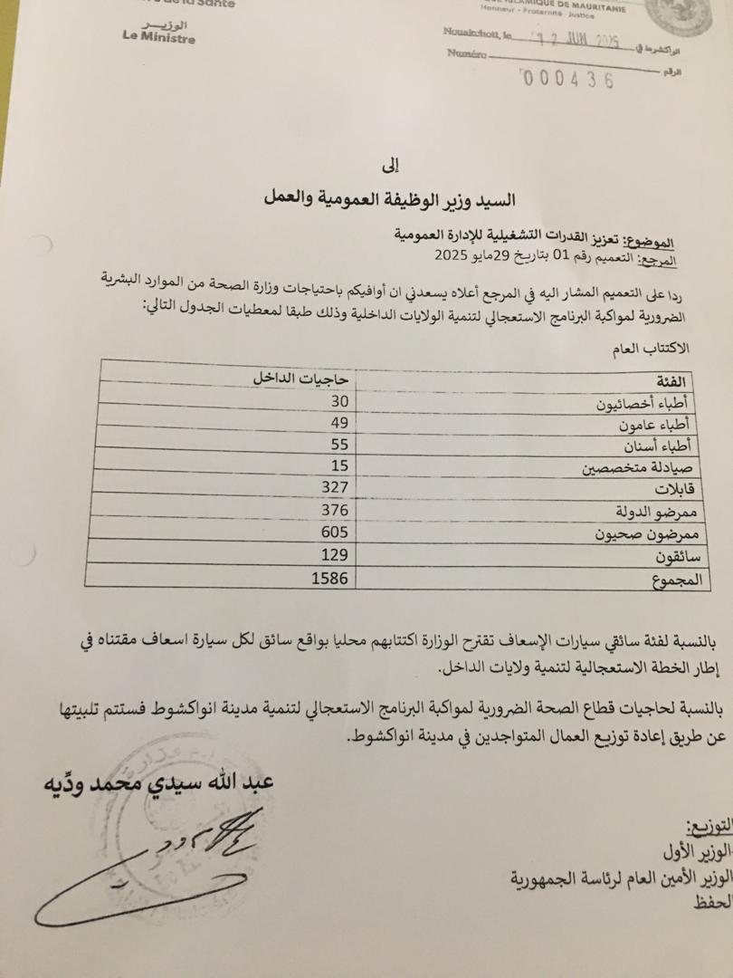 وجهت وزارة الصحة، في مراسلة رسمية بتاريخ 29 مايو 2025 إلى وزارة الوظيفة العمومية والعمل، طلبًا باكتتاب 1586 موظفًا صحيًا، وذلك ضمن جهودها لتنفيذ خطة التنمية الصحية وتعزيز الكادر الطبي في ولايات الداخل.