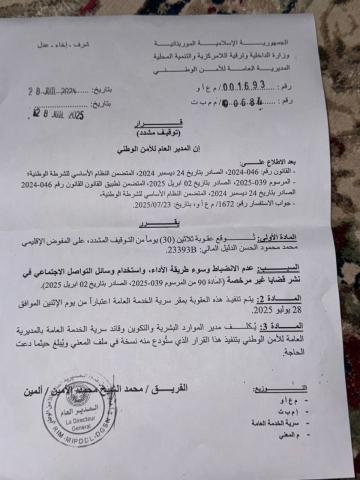 وة أصدر المدير العام للأمن الوطني الفريق محمد الشيخ ألمين برور قرارًا إداريًا يحمل الرقم 1694، يقضي بالتوقيف المشدد للمفوض الإقليمي محمد محمود ولد سيدي يحي لمدة ثلاثين يومًا، ابتداءً من يوم الاثنين القادم.
