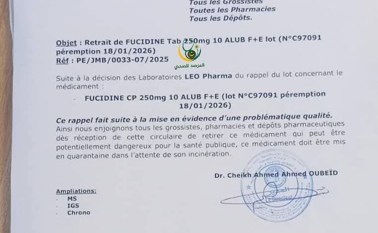 أصدرت وزارة الصحة في موريتانيا تعميما بتاريخ 1 أغسطس 2025 يقضي بسحب جميع كميات دواء FUCIDINE Tab 250mg 10 ALUB F+E من السوق المحلية.