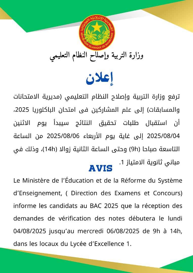 فتحت وزارة التربية وإصلاح النظام التعليمي (مديرية الامتحانات والمسابقات) باب استقبال طلبات التحقق من النتائج فى امتحان الباكلوريا 2025.
