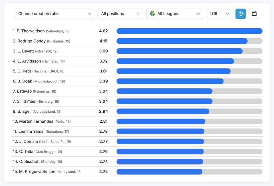 حل صانع ألعاب صانع ألعاب المنتخب الوطني و نادي لوزان السويسري ثالثًا على مستوى العالم بين لاعبي تحت 19 عامًا في معدل صناعة الفرص خلال موسم 2024/2025، بمتوسط 3.99 فرصة في المباراة