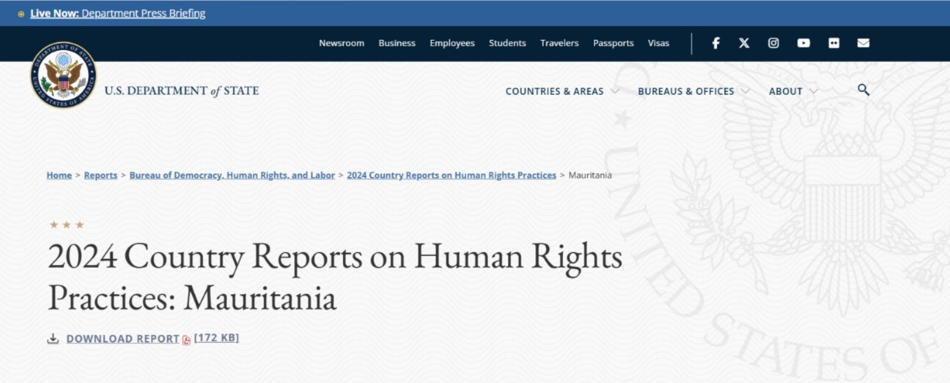 خلص تقرير صادر عن وزارة الخارجية الأمريكية إلى أن انتهاكات حقوق الإنسان ما تزال مستمرة في موريتانيا على الرغم من التقدم القانوني والمؤسسي الذي تم إحرازه في البلاد.