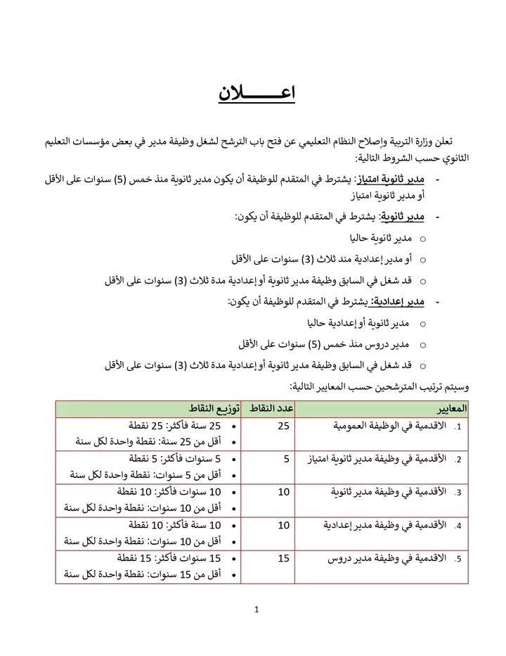 الرئيسية/أخبار وطنية/فتح باب الترشح لشغل وظيفـــة مدير في بعض مؤسسات التعلــيم الثانوي أخبار وطنية فتح باب الترشح لشغل وظيفـــة مدير في بعض مؤسسات التعلــيم الثانوي .آخر أجل للترشح 21 من الجاري اظهر المزيد شاركها فيسبوك X واتساب مشاركة عبر البريد طباعة