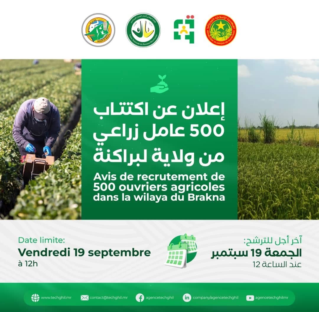 تنفيذا لاتفاقية التعاون المبرمة بين جهة لبراكنه واتحاد أرباب العمل الموريتانيين، تعلن الوكالة الوطنية للتشغيل (تشغيل) عن فتح باب التسجيل للاستفادة من 500 فرصة عمل لاكتتاب عمال زراعيين من ولاية لبراكنه.