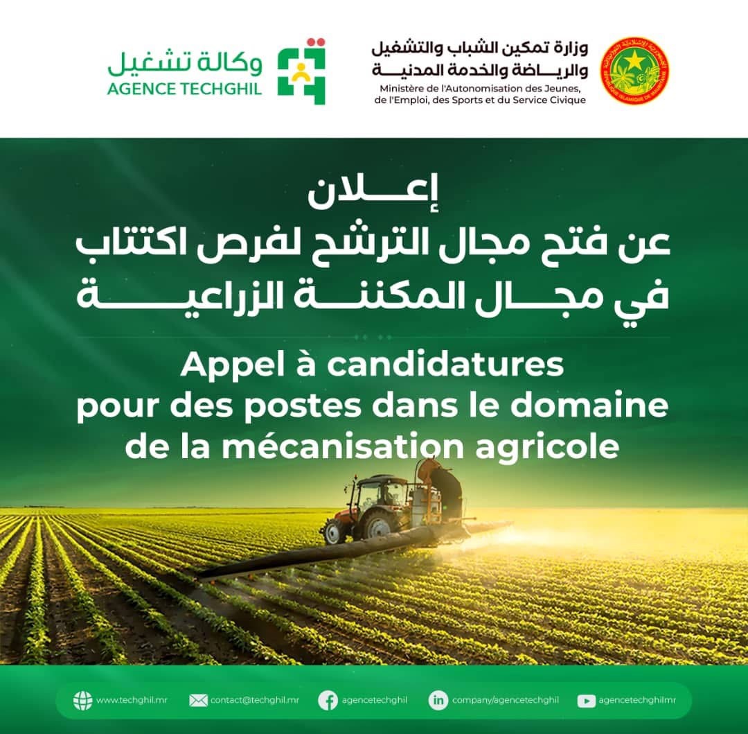في إطار الاتفاقية الثلاثية المتعلقة بالمكننة الزراعية، والموقعة مع المجالس الجهوية، تعلن وزارة تمكين الشباب والتشغيل والرياضة والخدمة المدنية، عن توفر فرص الاكتتاب التالية: