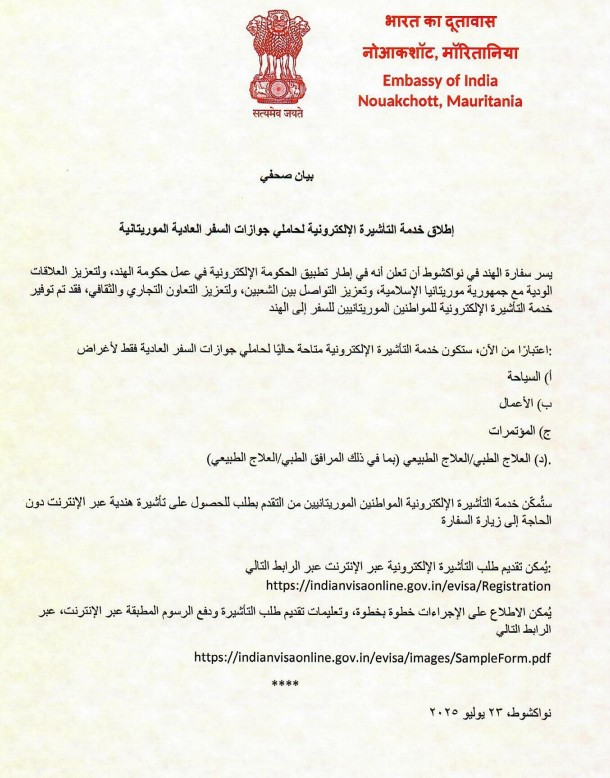 أعلنت سفارةُ الهند في نواكشوط عن إطلاق خدمة التأشيرة الإلكترونية لحاملي جوازات السفر العادية الموريتانية.