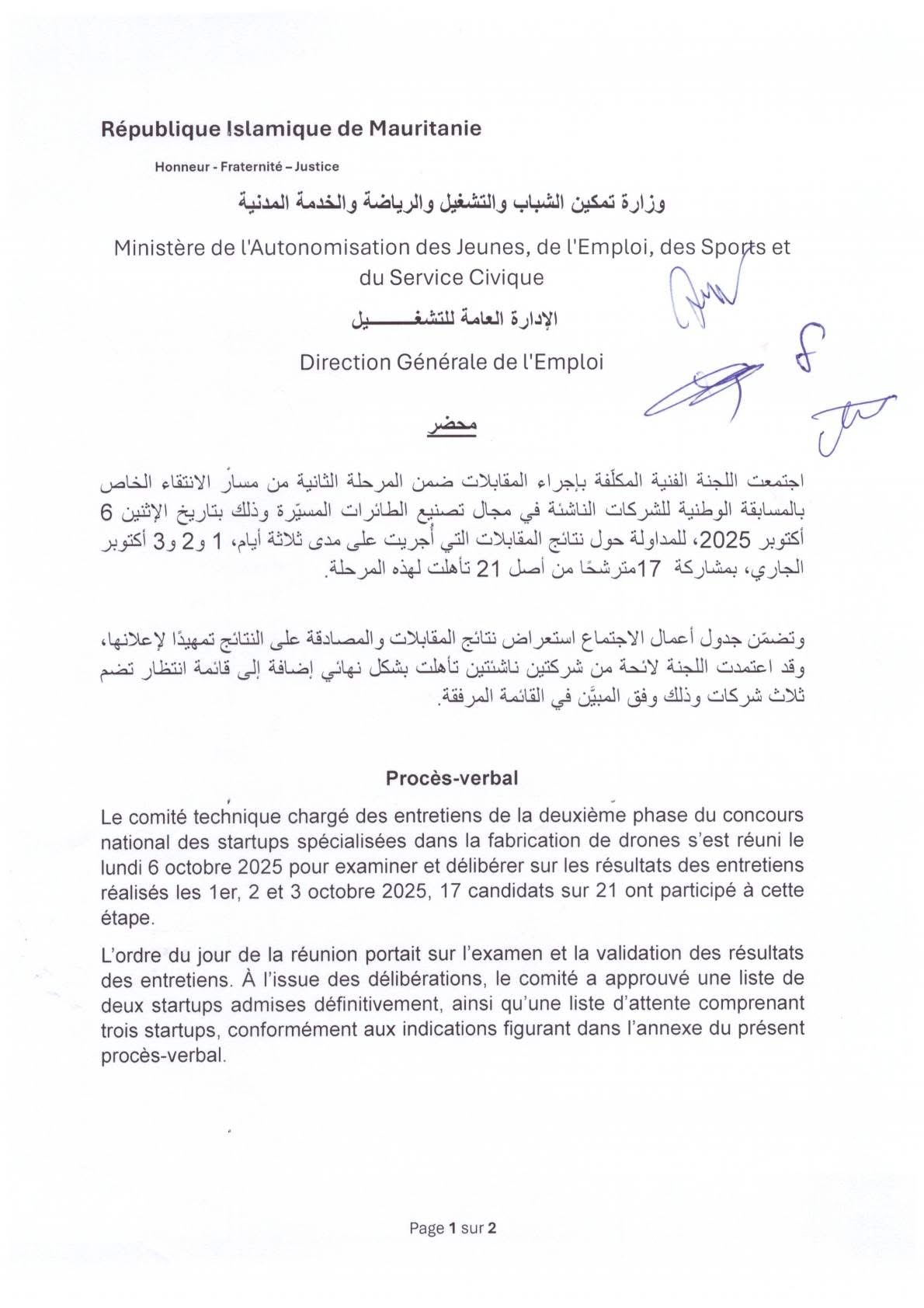 تُعلن وزارة تمكين الشباب والتشغيل والرياضة والخدمة المدنية، من خلال اللجنة المكلفة بالإشراف على المسابقة الوطنية الموجهة للشركات الناشئة المتخصصة في تصنيع ا الطائرات المسيّرة، أنه وبعد تقييم المقابلات التي أجرتها اللجنة الفنية المختصة لــــ 21 مترشحًا تأهلوا لهذه المرحلة، تم اعتماد قائمة نهائية تضم شركتين ناشئتين تأهلت بشكل نهائي، بالإضافة إلى قائمة انتظار تتضمن ثلاثة (3) مترشحين.