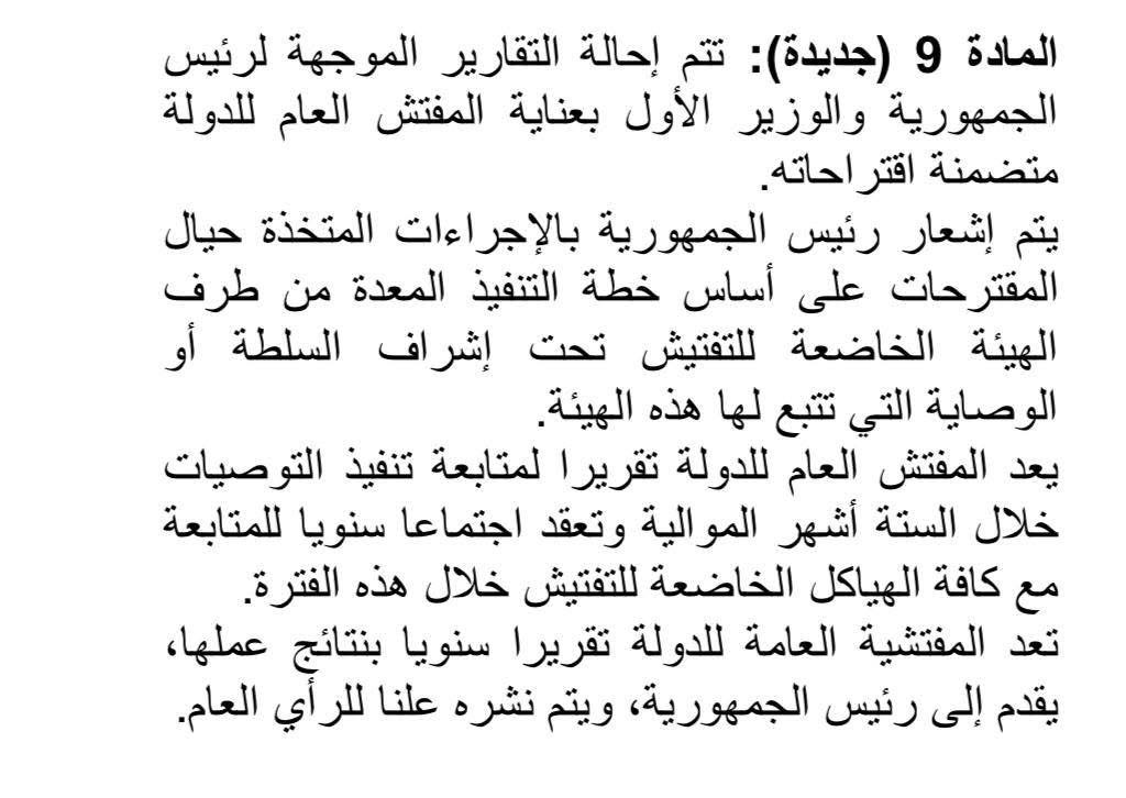 كما نصت الفقرة الثالثة من نفس المادة على أن يُعدّ المفتش العام للدولة تقريرًا خاصًا بمتابعة تنفيذ التوصيات خلال ستة أشهر من صدور التقرير السنوي، على أن تُعقد خلال هذه الفترة اجتماعات متابعة مع الهيئات التي خضعت للتفتيش.