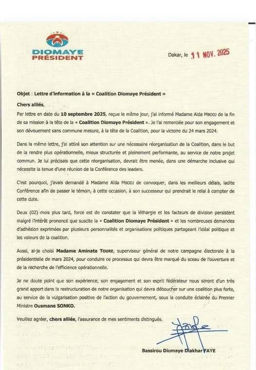 في بيان موقع باسمه، أقال الرئيس السنغالي بصيرو ديوماي فاي، عيساتا مبودج من رئاسة ائتلاف “ديوماي رئيسا” الذي تشكل خلال الرئاسيات السابقة، وعين خليفة لها ٱمناتا توري، متحدثا عن أن الأمر يدخل في إطار إعادة تنشيط الائتلاف، وجعله “أكثر فاعلية وتنظيما وأداء، في خدمة المشروع المشترك”.
