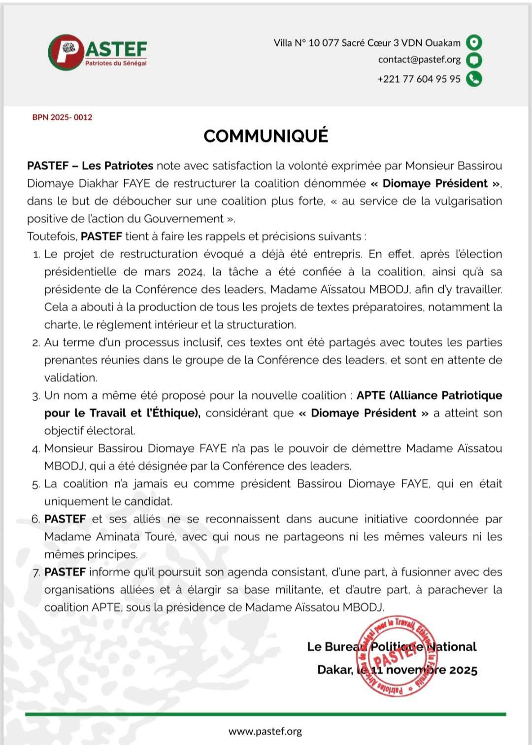بالمقابل رد الحزب الحاكم “باستيف” ببيان قال فيه إن ديوماي فاي ليس من حقه إقالة مبودج، وبأنه ليس رئيسا للائتلاف، وإنما ترشح باسمه.