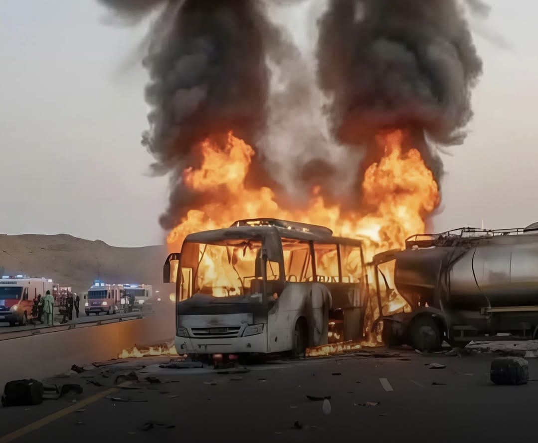 مصرع عشرات المعتمرين في حادث اصطدام حافلة بصهريج نفط بالمدينة المنورة