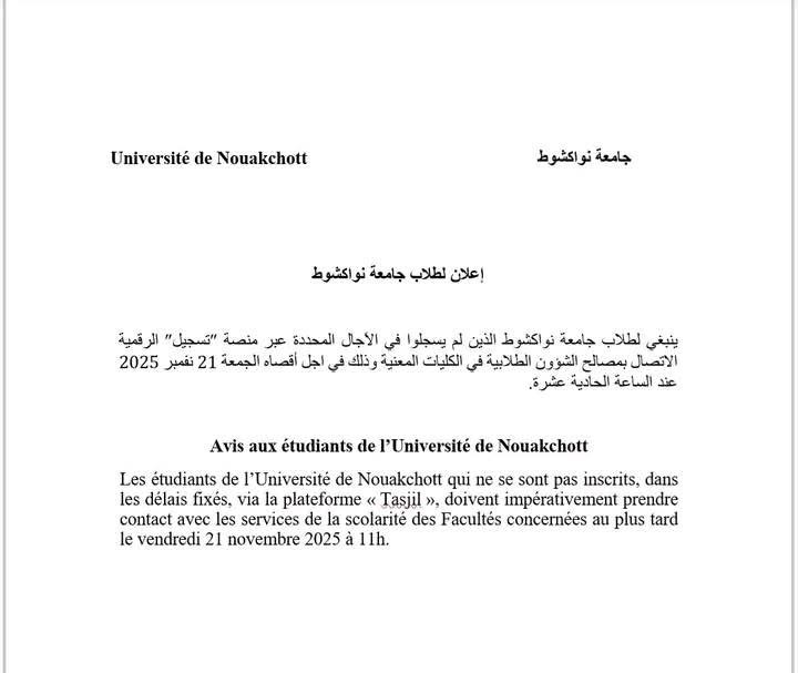 الرئيسية/منوعات/إعلان لطلاب جامعة نواكشوط. منوعات إعلان لطلاب جامعة نواكشوط. اظهر المزيد شاركها فيسبوك X واتساب مشاركة عبر البريد طباعة