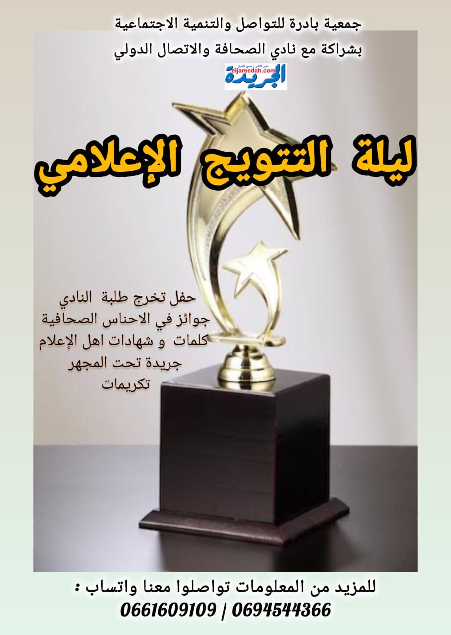 اختفالا بذكرى عيد العرش المجيد ، تنظم جمعية بادرة للتواصل والتنمية الاجتماعية بشراكة مع نادي الصحافة والاتصال الدولي و جريدة الجريدة بوان كوم تظاهرة وطنية عربية تحت عنوان : ليلة التتويج الإعلامي .