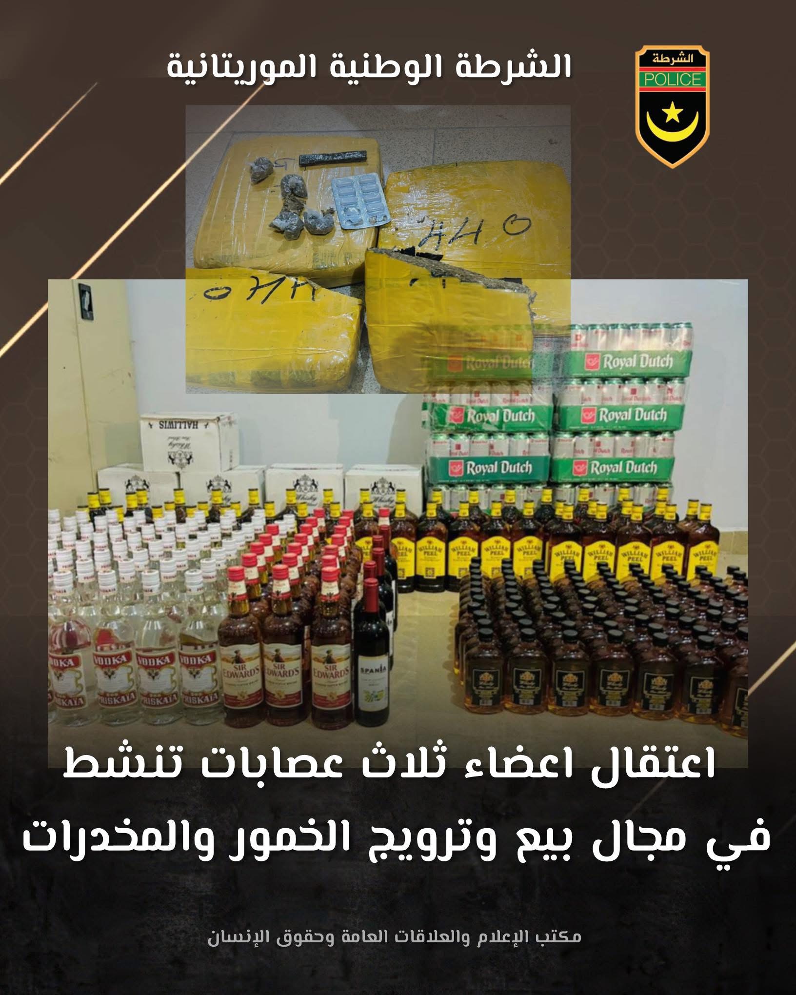 تمكن المكتب المركزي لمكافحة المخدرات والمؤثرات العقلية يوم الثلاثاء 18 نوفمبر 2025، من تفكيك واعتقال اعضاء ثلاث عصابات تنشط في مجال بيع و ترويج الخمور والحشيش الهندي و مشروب السمسم بالعاصمة انواكشوط، موزعين على النحو التالي: