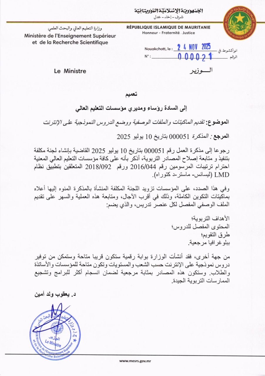 أصدر وزير التعليم العالي والبحث العلمي يعقوب ولد مين تعميمًا يوجّه مؤسسات التعليم العالي إلى تقديم الماكيتات والملفات الوصفية، ووضع الدروس النموذجية على الإنترنت.