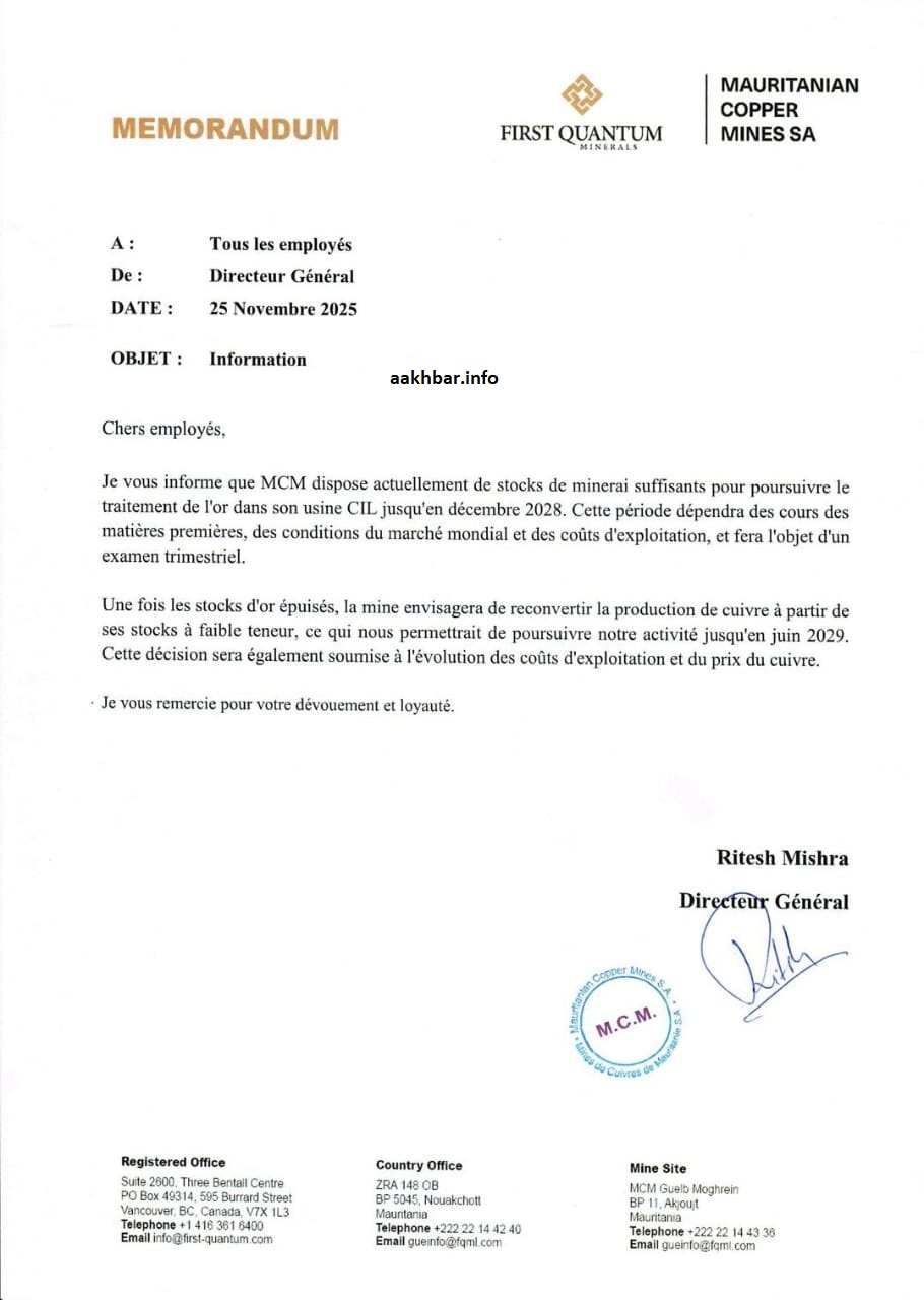 أبلغت شركة نحاس موريتانيا MCM المملوكة لشركة First Quantum Minerals Ltd الكندية عمالها أن لديها الآن مخزونا يخولها الاستمرار في إنتاج الذهب حتى ديسمبر 2028، منبهة إلى أنها تخطط لاستئناف إنتاج النحاس انطلاقا من مخزون منخفض التركيز.
