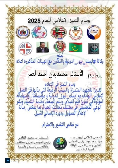 في لفتة تقديرية تعكس الاعتراف بالكفاءات المهنية الجادة، منحت مؤسسة «إيسك أنيوز الدولية»، بالتعاون مع عدد من الهيئات الإعلامية، وسام التميّز الإعلامي للنقيب والعميد محمد بدن أحمد لعمر، وذلك تثمينًا لمساره الإعلامي وما قدّمه من إسهامات نوعية تركت أثرًا واضحًا في المشهد الإعلامي خلال السنوات الأخيرة.