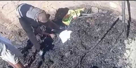 وقد تم انتشال جثمان الرضيع الذي يبلغ من العمر عاما واحدا من تحت ركام سقف الكوخ المحترق بجهود محلية في مشهد صادم لذويه وسكان القرية.
