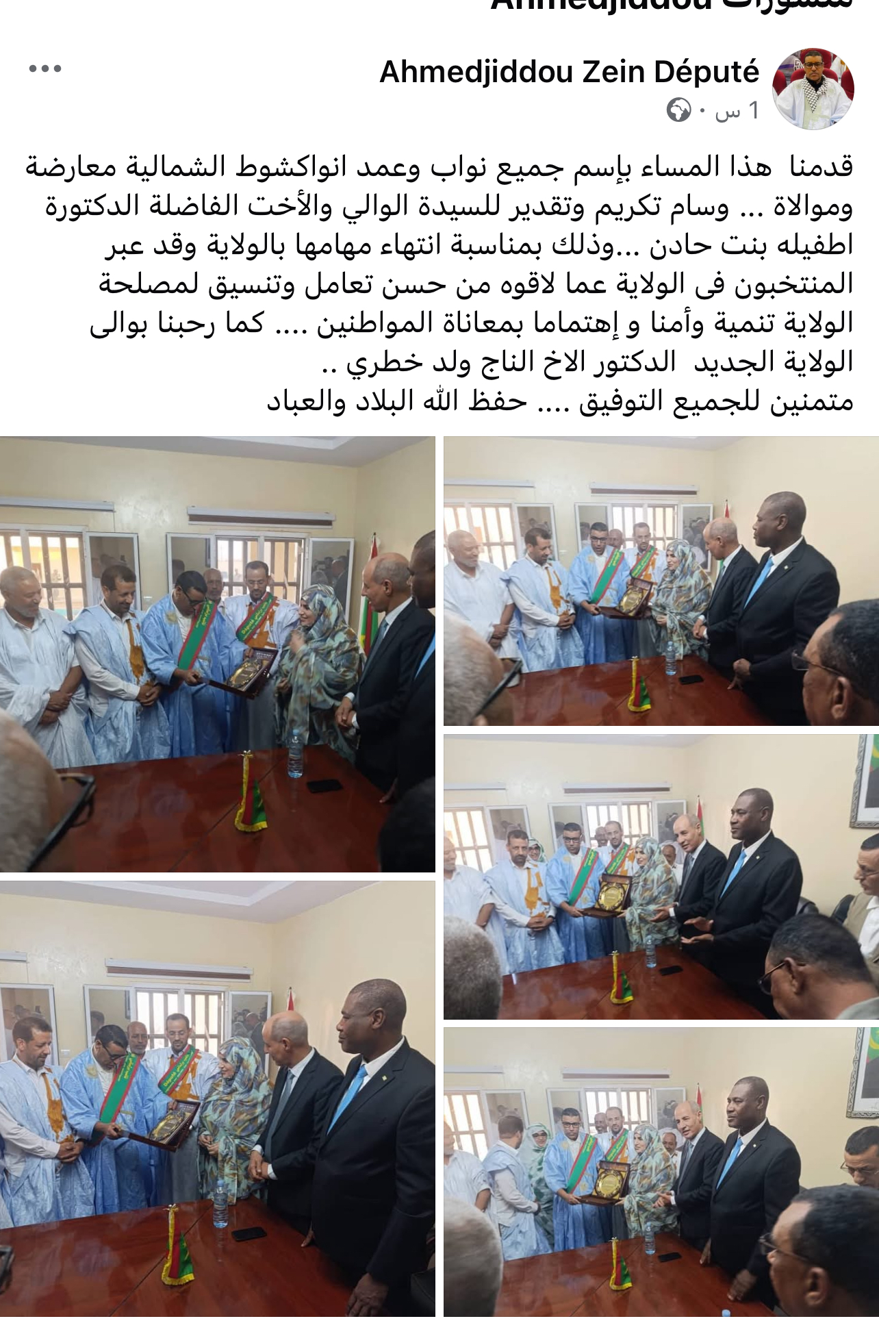 قدمنا هذا المساء بإسم جميع نواب وعمد انواكشوط الشمالية معارضة وموالاة … وسام تكريم وتقدير للسيدة الوالي والأخت الفاضلة الدكتورة اطفيله بنت حادن …وذلك بمناسبة انتهاء مهامها بالولاية وقد عبر المنتخبون فى الولاية عما لاقوه من حسن تعامل وتنسيق لمصلحة الولاية تنمية وأمنا و إهتماما بمعاناة المواطنين …. كما رحبنا بوالى الولاية الجديد الدكتور الاخ الناج ولد خطري ..