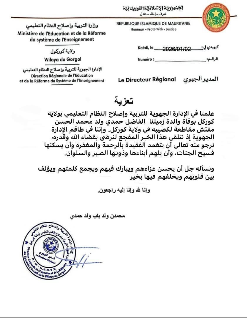الرئيسية/منوعات/الادارة الجهوية للتعليم فى كوركول تعزي فى وفاة والدة المفتش الفاضل حمدي ولد محمد الحسن، مفتش مقاطعة لكصيبه. منوعات الادارة الجهوية للتعليم فى كوركول تعزي فى وفاة والدة المفتش الفاضل حمدي ولد محمد الحسن، مفتش مقاطعة لكصيبه. اظهر المزيد شاركها فيسبوك X واتساب مشاركة عبر البريد طباعة