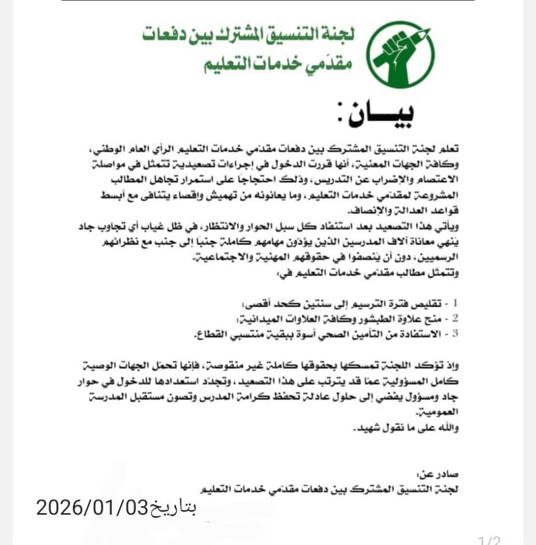 قررت لجنة التنسيق المشترك بين دفعات مقدمي خدمات التعليم الدخول في إضراب مفتوح، ابتداءً من تاريخ يحدد لاحقًا، وذلك في إطار تصعيد نضالي يهدف إلى الضغط على الجهات المعنية للاستجابة لمطالبهم المشروعة.