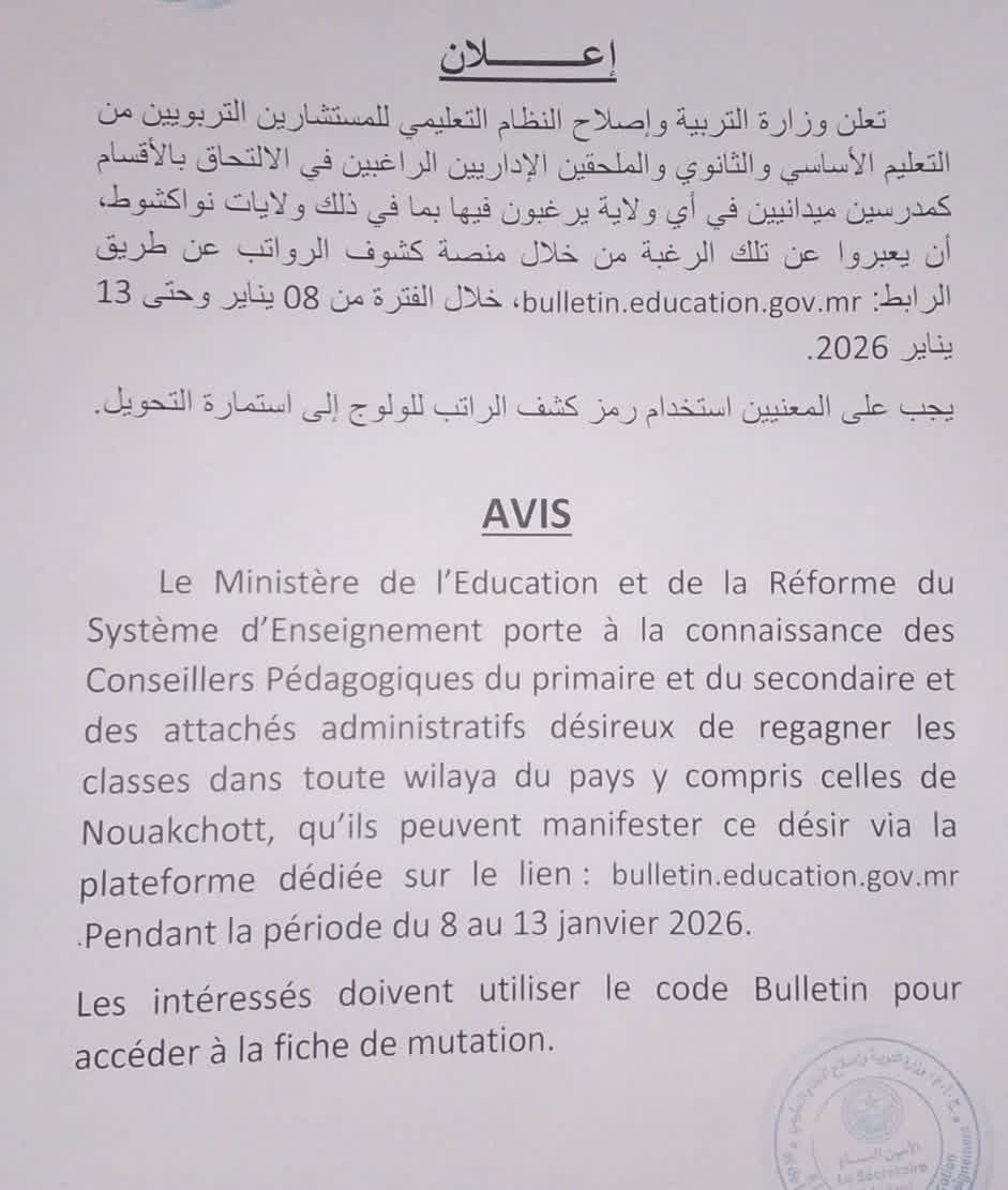 تعلن وزارة التربية وإصلاح النظام التعليمي للمستشارين التربويين من التعليم الأساسي والثانوي والملحقين الإداريين الراغبين في الالتحاق بالأقسام كمدرسين ميدانيين في أي ولاية يرغبون فيها، بما في ذلك ولايات نواكشوط، أن يعبروا عن تلك الرغبة من خلال منصة كشوف الرواتب عن طريق الرابط:
