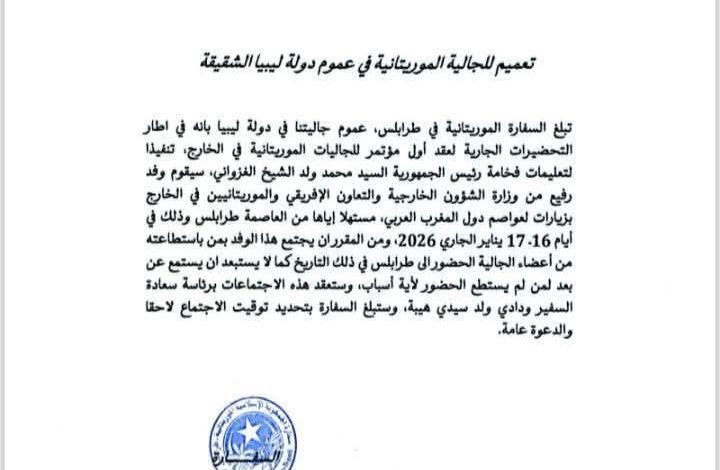 وأوضحت السفارة، في تعميمها، أن هذا الاجتماع يأتي تنفيذًا لتعليمات فخامة رئيس الجمهورية السيد محمد ولد الشيخ الغزواني، وبتنسيق مع وزارة الشؤون الخارجية والتعاون الإفريقي والموريتانيين في الخارج، وذلك في إطار زيارة مرتقبة لوفد رسمي رفيع المستوى إلى دول المغرب العربي، تكون العاصمة الليبية طرابلس إحدى محطاتها.
