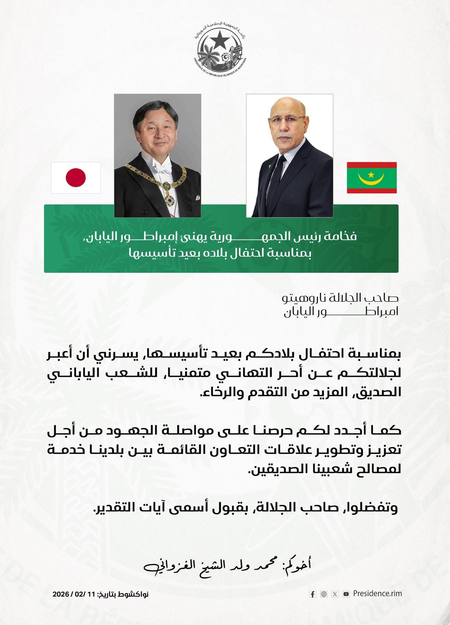 الرئيسية/أخبار وطنية/رئيس الجمهورية يهنئ إمبراطور اليابان بمناسبة احتفال بلاده بعيد تأسيسها. أخبار وطنية رئيس الجمهورية يهنئ إمبراطور اليابان بمناسبة احتفال بلاده بعيد تأسيسها. اظهر المزيد شاركها فيسبوك X واتساب مشاركة عبر البريد طباعة