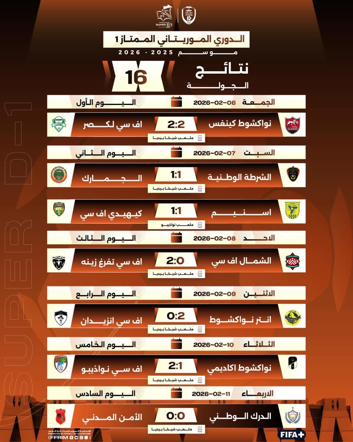 الرئيسية/رياضة وترفيه/موريتانيا ؛ النتائج والترتيب العام للدوري الممتاز 1مع نهاية الجولة السادسة عشرة من البطولة. رياضة وترفيه موريتانيا ؛ النتائج والترتيب العام للدوري الممتاز 1مع نهاية الجولة السادسة عشرة من البطولة. اظهر المزيد شاركها فيسبوك X واتساب مشاركة عبر البريد طباعة