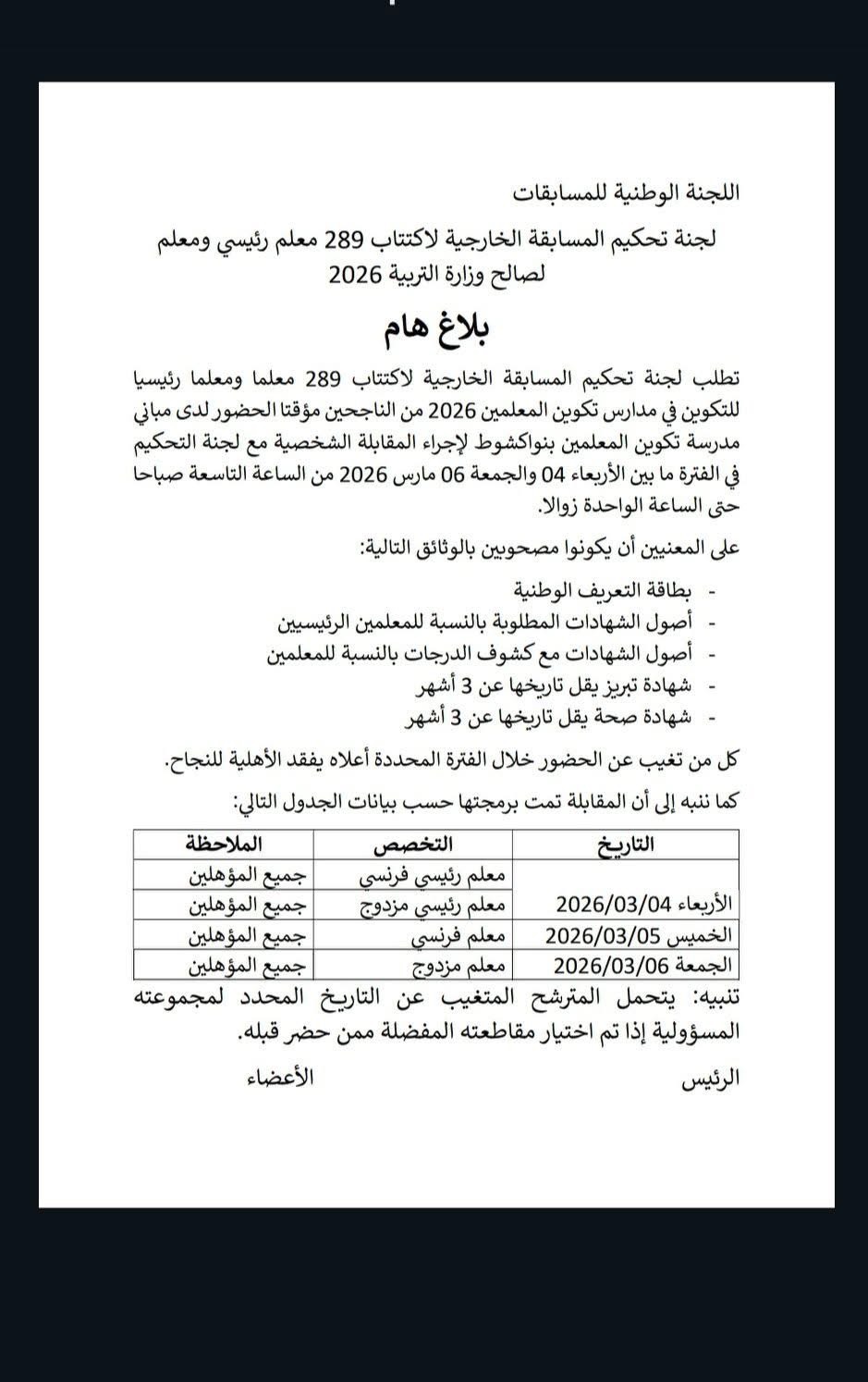 تطلب لجنة تحكيم المسابقة الخارجية لاكتتاب 289 معلما ومعلما رئيسيا للتكوين في مدارس تكوين المعلمين 2026 من الناجحين مؤقتا الحضور لدى مباني مدرسة تكوين المعلمين بنواكشوط لإجراء المقابلة الشخصية مع لجنة التحكيم في الفترة ما بين الأربعاء 04 والجمعة 06 مارس 2026 من الساعة التاسعة صباحا حتى الساعة الواحدة زوالا.