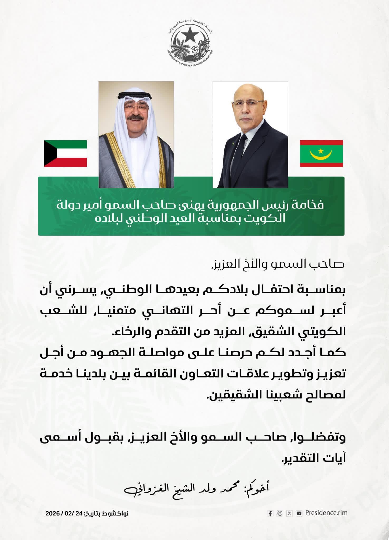 وجه فخامة رئيس الجمهورية، السيد محمد ولد الشيخ الغزواني، اليوم الثلاثاء، برقية تهنئة إلى سمو الشيخ صباح خالد الحمد الصباح ولي عهد دولة الكويت، بمناسبة احتفال بلاده بعيدها الوطني.