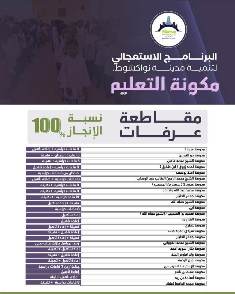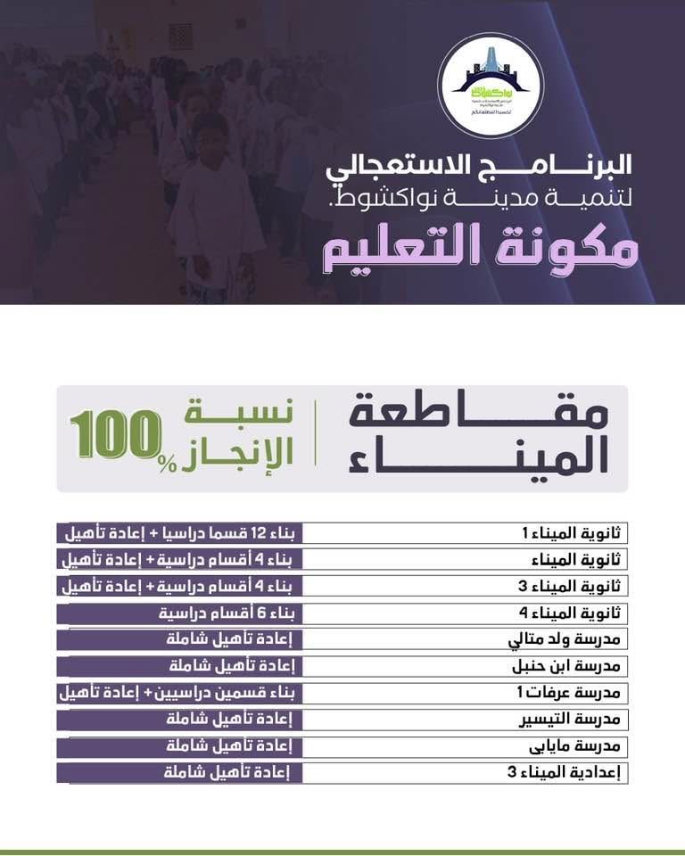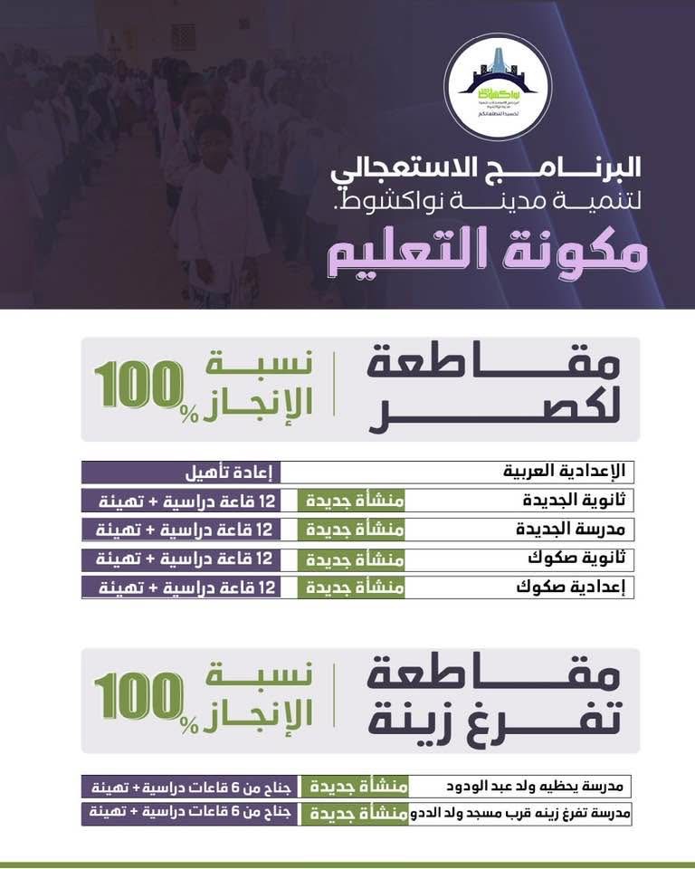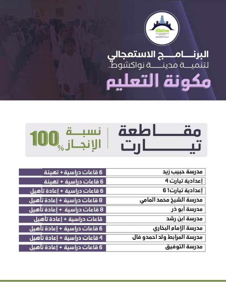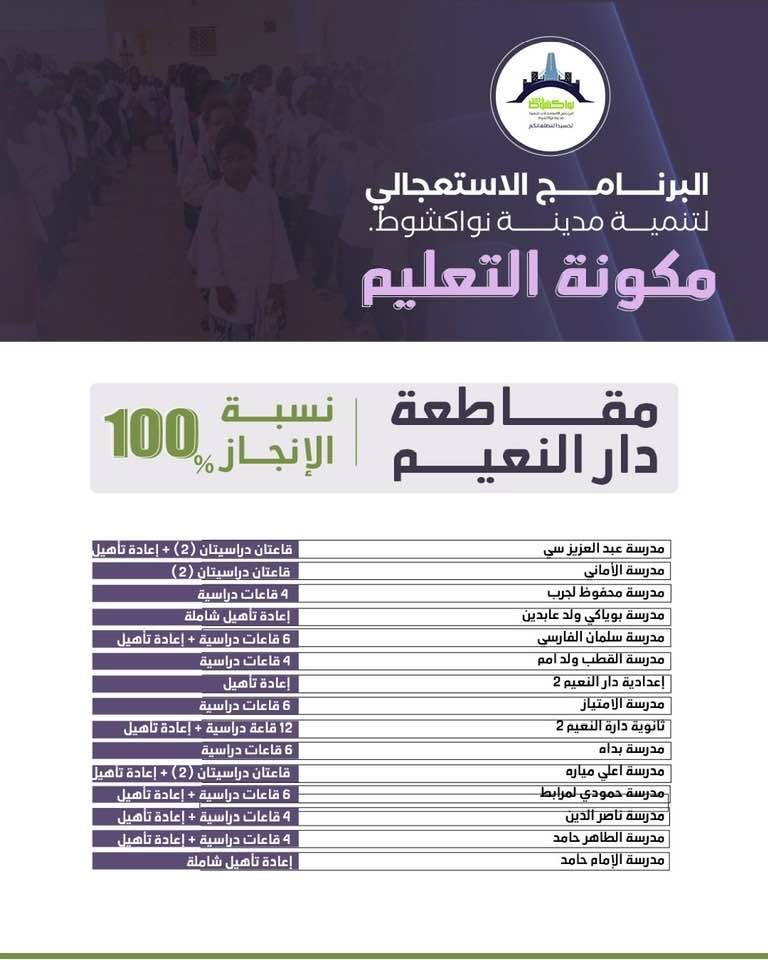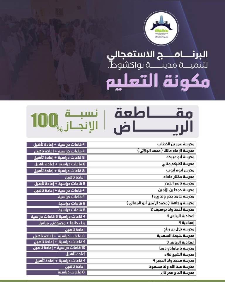 انتهت الأعمال في كل هذه المؤسسات و تستقبل حاليا عشرات آلاف التلاميذ. و قد حدت بشكل كبير من الإكتظاظ في مقاطعات مثل الرياض، توجنين، دار النعيم و الميناء حيث كانت عدد التلاميذ في القسم يزيد غالبا علي 120.