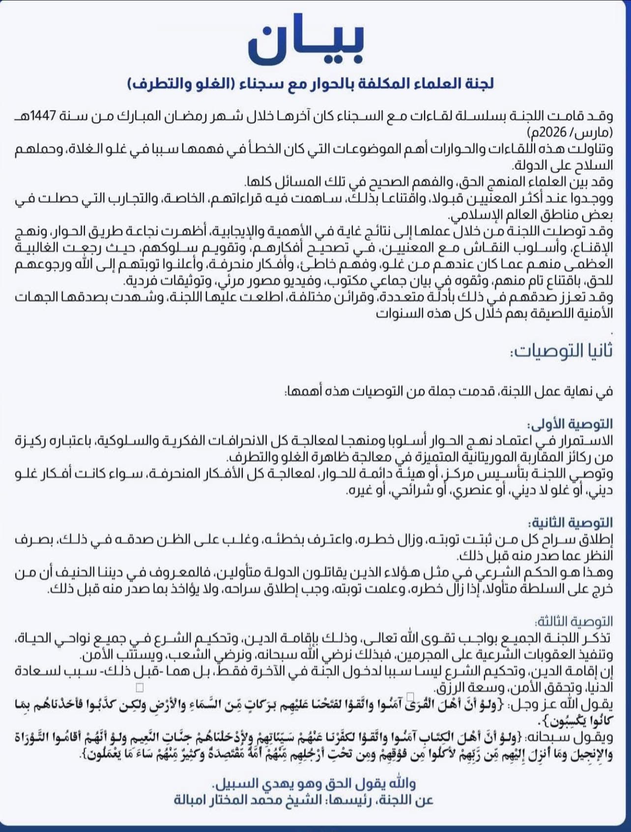بناء على تكليف من رئيس الجمهورية السيد محمد بن الشيخ الغزواني، وبإشراف من الجهات المختصة، تم تشكيل لجنة من العلماء لاستئناف الحوار مع سجناء الغلو والتطرف.