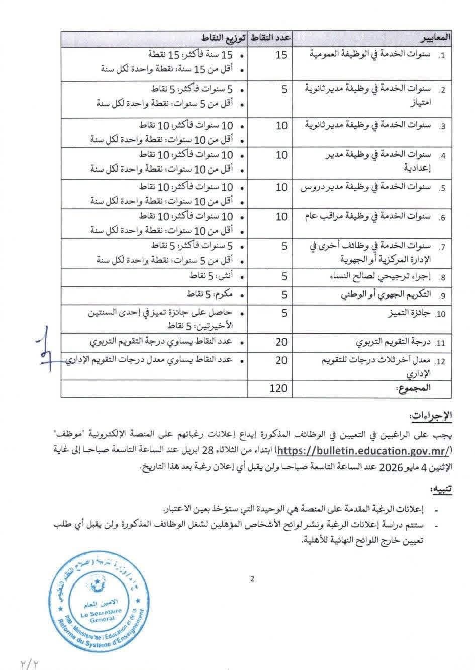 في إطار التحضير لافتتاح السنة الدراسية 2026 – 2027، تعلن وزارة التربية وإصلاح النظام التعليمي للراغبين في التعيين في وظائف مديرين ومديري دروس ومراقب عام الشاغرة في بعض مؤسسات التعليم الإعدادي والثانوي عن فتح باب إيداع إعلانات الرغبة حسب الشروط التالية: