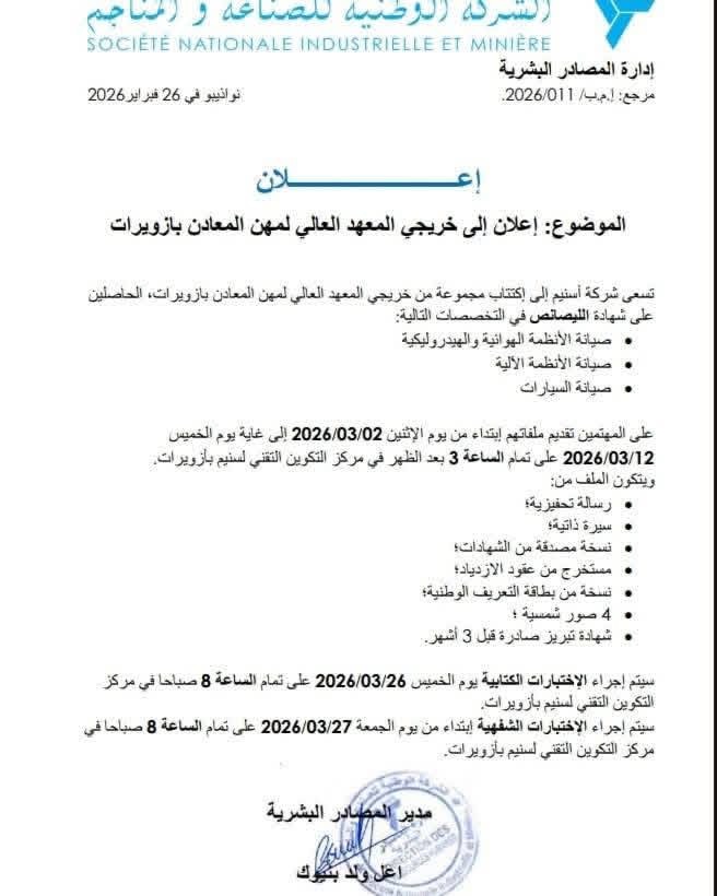سنيم” تعلن عن اكتتاب خاص بخريجي معهد المعادن بالزويرات