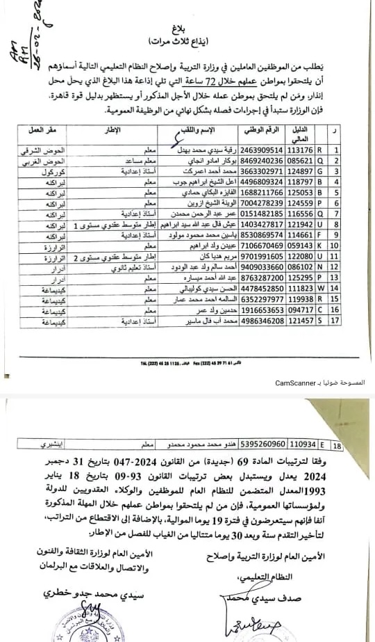 وزارة التربية تدعو 17 موظفا للالتحاق بعملهم وتلوح بفصلهم
